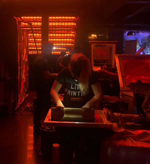 Take a lookBy far this is our most common activation type. Screen printing fits a wide range of garments and print locations. Guests LOVE the look of the spinning presses and the ability to see their shirts printed using this tried and true technique, plus the shirts are handed to them literally hot off the press!